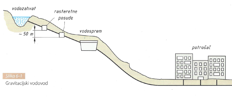 Na slici 6-1 prikazan je gravitacijski vodovod sa svim svojim sastavnim dijelovima.