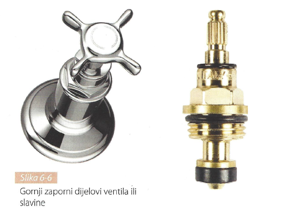 U zapornu armaturu uglavnom ubrajamo gornje dijelove ventila i slavine (slika 6-6). Zaporna armatura služi isključivo za otvaranje i zatvaranje protoka vode. Gornji dijelovi mogu biti različitih oblika i kvalitete izrade.
