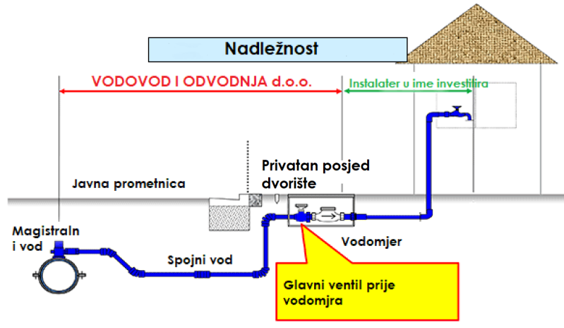 Kod privatnih kuća spojni vod se priključuje na vodomjernicu (šaht), koji ima dimenzije 1200 (dužina) x 800 (širina) x 1500 (visina), s poklopcem na vrhu.