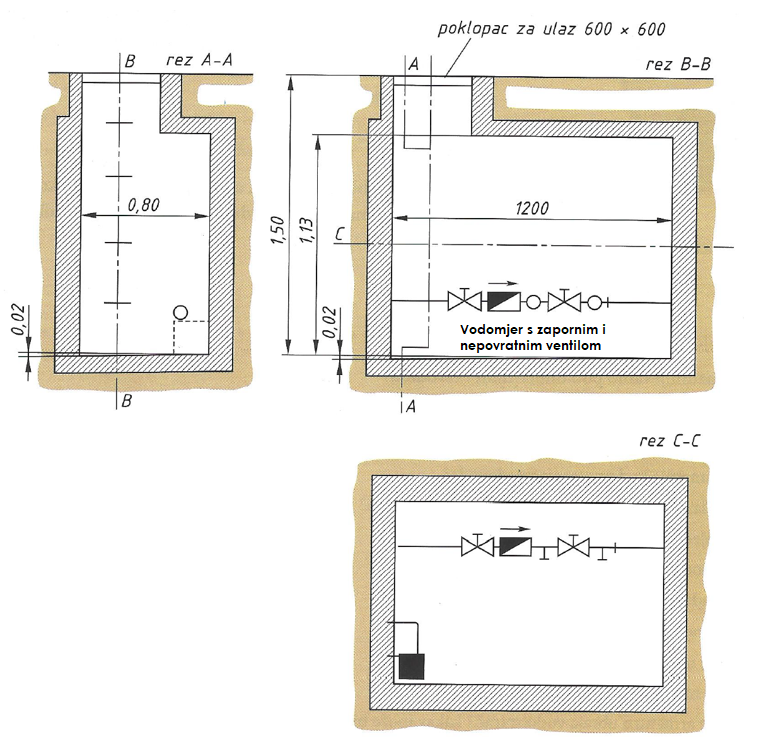Slika 6-9 Vodomjernica (šaht) za ugradnju vodomjera pred kućom, sa standardnim dimenzijama 1200x800x1500 mm