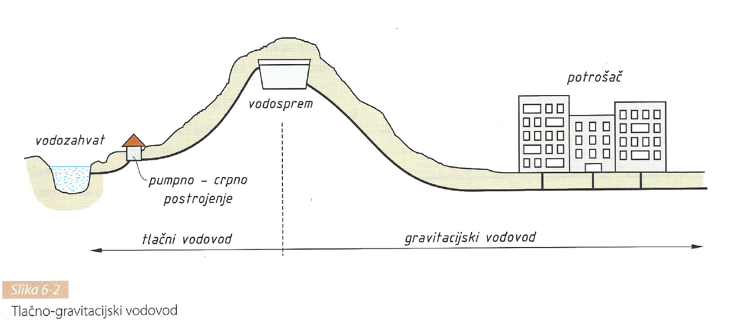 Kod tlačno - gravitacijskog vodovoda prikazanog na slici 6-2 vidimo da se između vodozahvata i mjesta potrošnje prepriječilo uzvišenje, brdo. Na brdu se onda izrađuje vodosprem.