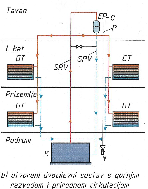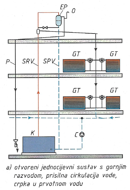 K - kotao, C - cirkulacijska crpka, GT - grijaće tijelo, SRV - sigurnosni polazni vod, SPV - sigurnosni povratni vod, P - preljev, O - odzračni vod.