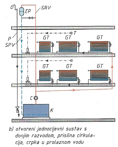 Slika prikazuje jednocijevni sustav s horizontalnim razvodom te prisilnom cirkulacijom vode za svaki kat zasebno