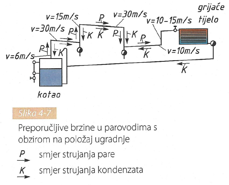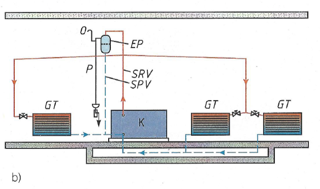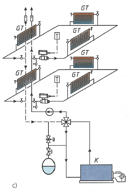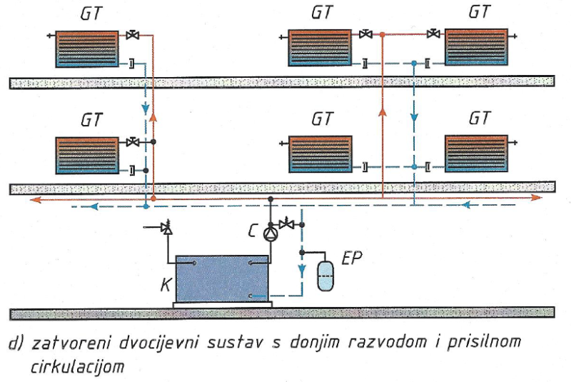 Slika 4-2 prikazuje jednocijevni i dvocijevni sustav grijanja s donjim i gornjim razvodom s crpkom u polaznom ili povratnom vodu.