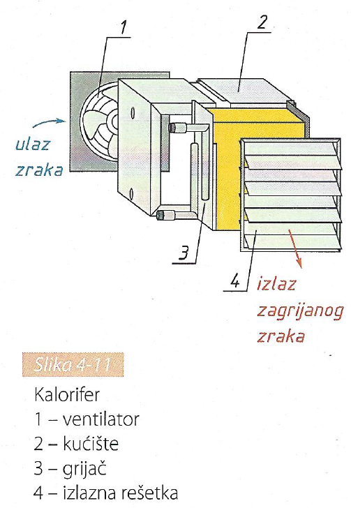 Kalorifer (slika 4-11), ventilokonvektor (slika 4 - 12) i termogen (slika 4 - 13) su uređaji koji služe za zračno grijanje i ventilaciju danih prostora.