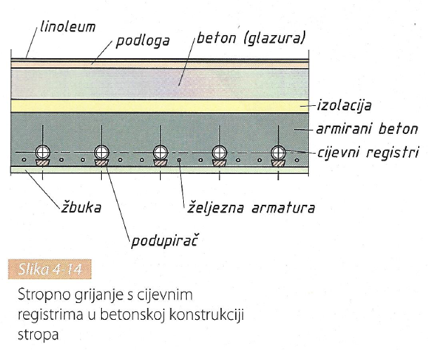 Cijevi ili cijevni registri polažu se u podnu konstrukciju koja s donje strane mora imati dobru toplinsku izolaciju (slika 4-19 i 4-20).