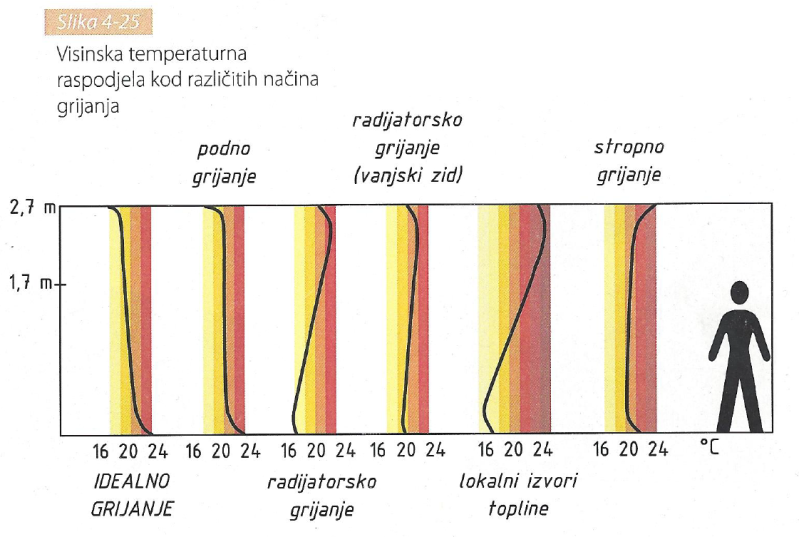 Slika 4-25 nam pokazuje da je podno grijanje bolje od ostalih ponuđenih grijanja jer je visinska temperaturna raspodjela podnog grijanja najbliža visinskoj temperaturnoj raspodjeli idealnog grijanja.
