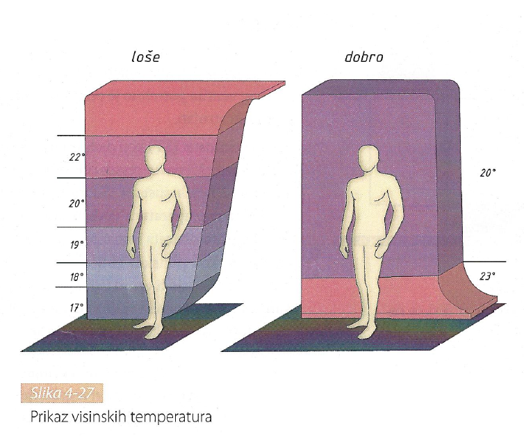 Slika 4-25 nam govori kod kojeg grijanja i gdje u prostoriji struji topliji ili hladniji zrak, a slika 4-27 gdje vladaju pojedine temperature i koja im je vrijednost.