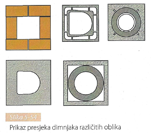 Presjek dimnjaka može biti kvadratni i kružni, a izrađuje se od gotovih elemenata tvrtke Schiedel, ako govorimo o zidanom dimnjaku.